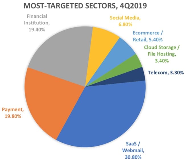 APWG member RiskIQ analyzed 2,149 confirmed phishing URLs reported to APWG in Q4 2019, and found that the most popular top-level domains used by the phishers are the generic .com, .org, .net and .info TLDs.