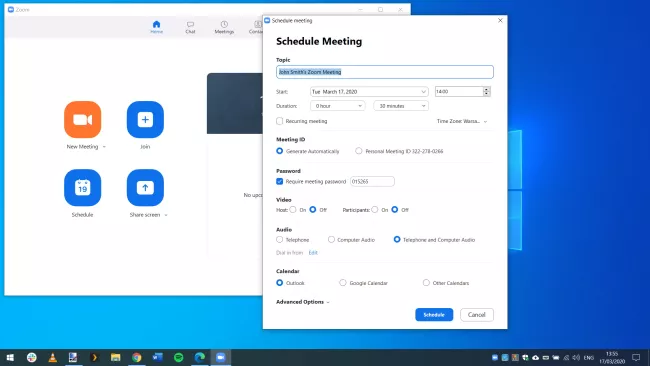 While there is nothing to stop you from setting up meetings on an ad-hoc basis, it’s a better idea for all concerned if they are scheduled for a known time. On the first screen of the Zoom application, click the ‘Schedule’ button and fill in the details such as a date, time and topic, and choose the calendar through which the meeting will be organised – Outlook, Google Calendar, or something else – and click the ‘Schedule’ button again.