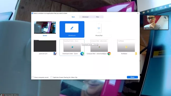 numerous options via the Share Screen button. You can open a whiteboard that everyone can write or draw on, share the contents of a window you have open on your desktop, or share a portion of your screen to give demonstrations.