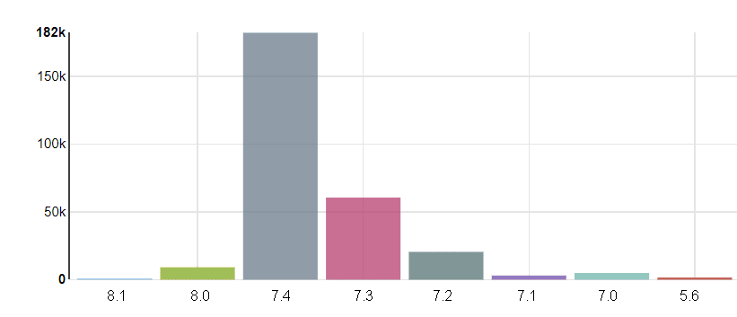Note that of all the sites running on PHP 7.0 or 7.1, only about half seem to be actively maintained — that is, running a WooCommerce version that is at most six months old.